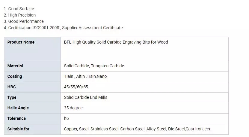 | Coating | TIN,TICN,AD,TIALN,ALTIN,TISIN,ETC. | Flutes | 2 |